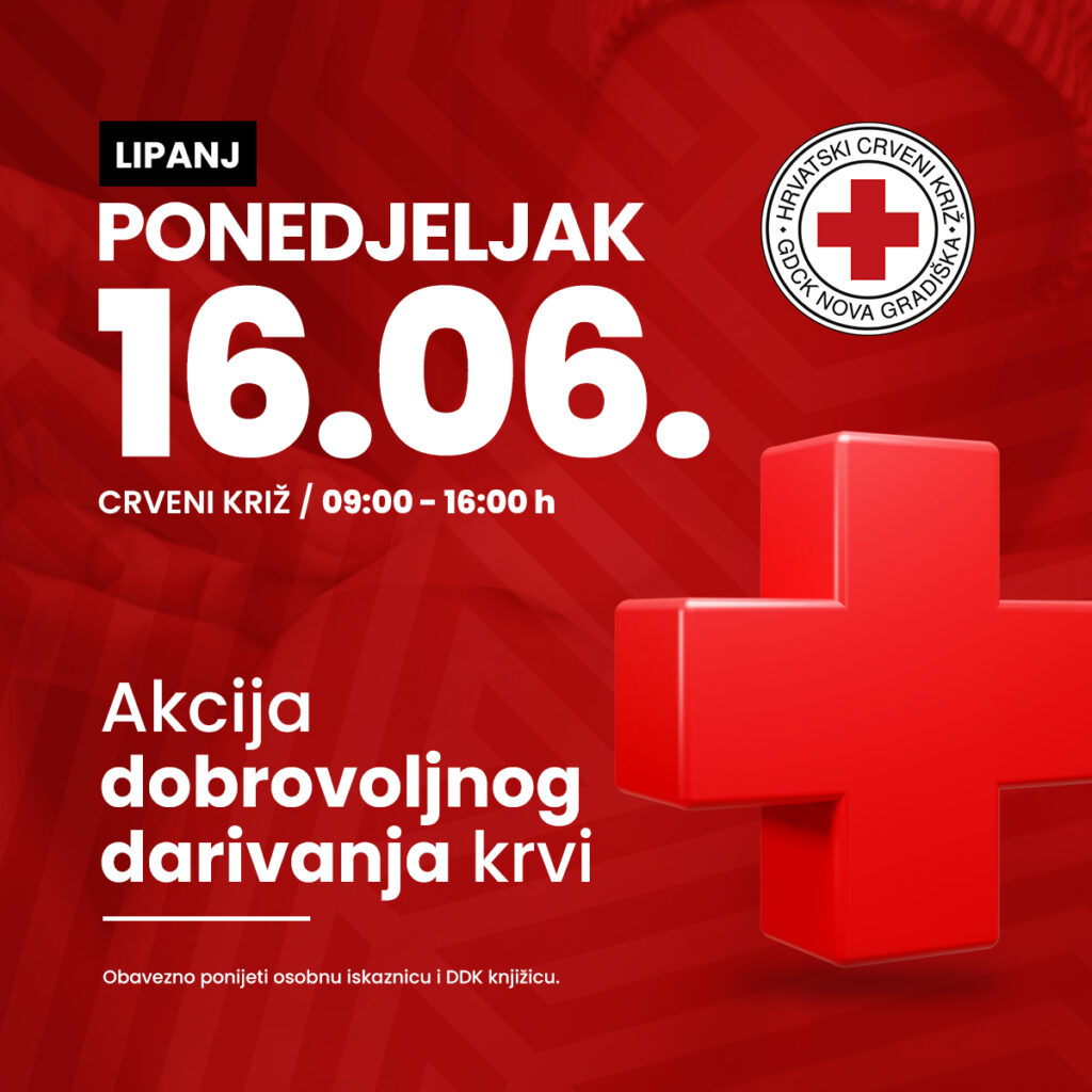 Akcija dobrovoljnog darivanja krvi u Novoj Gradiški održat će se u ponedjeljak (16.06.2025.) od 9 do 16 sati. Obavezno ponijeti osobnu iskaznicu i DDK knjižicu.