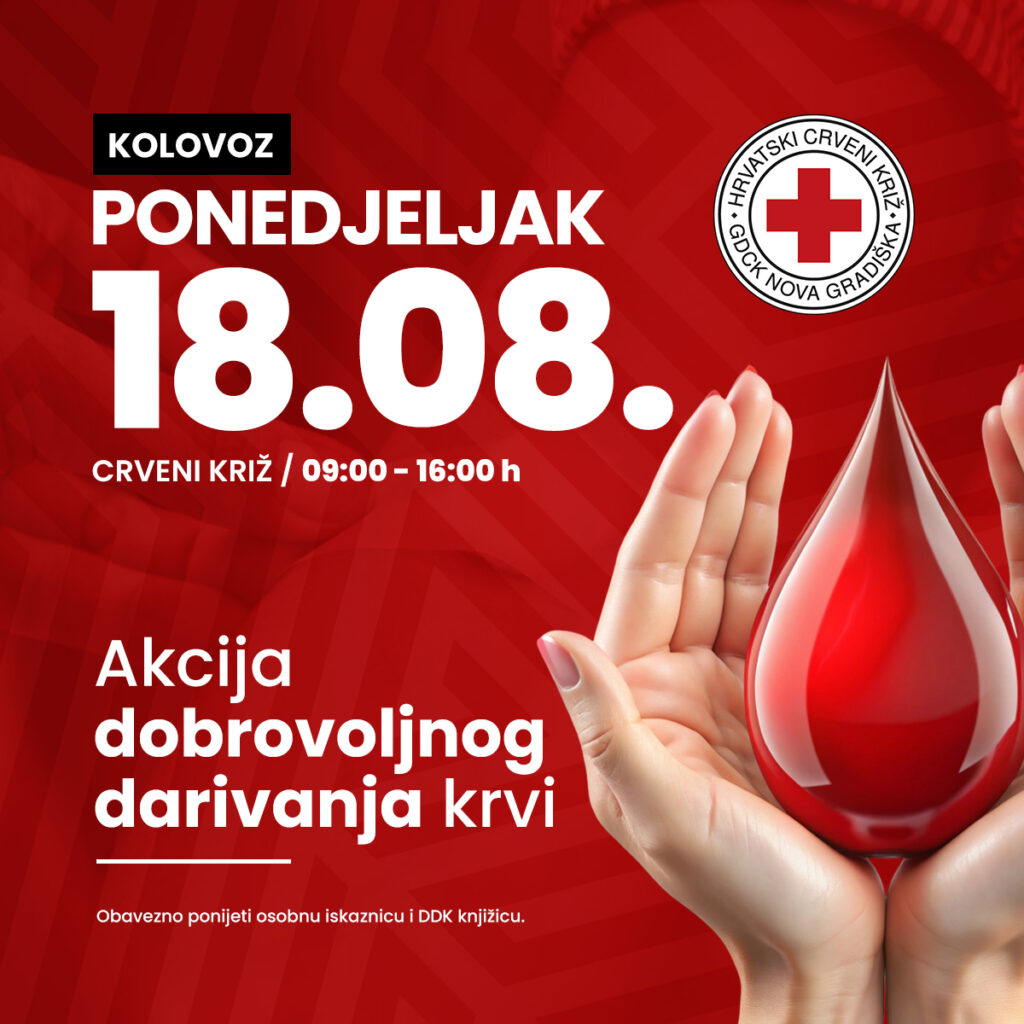 Akcija dobrovoljnog darivanja krvi u Novoj Gradiški održat će se u ponedjeljak (18.08.2025.) od 9 do 16 sati. Obavezno ponijeti osobnu iskaznicu i DDK knjižicu.